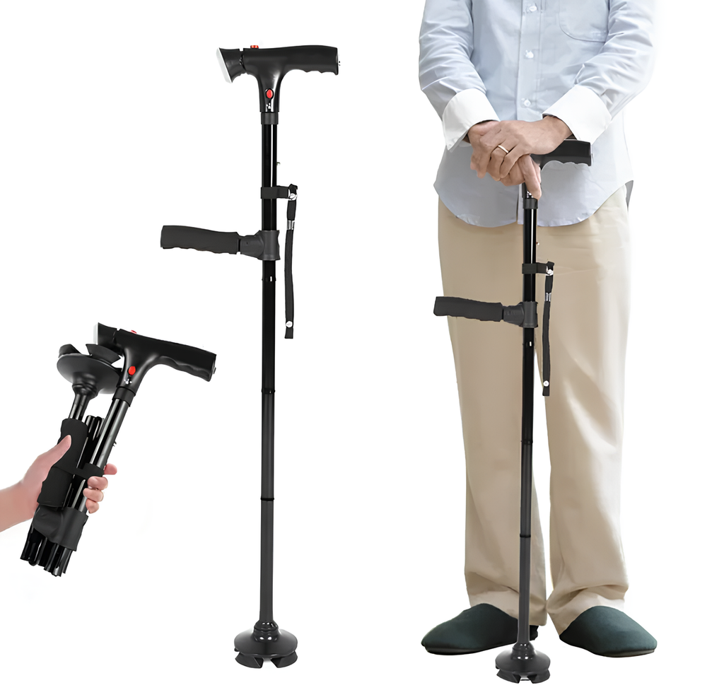 A Bengala SmartLight reúne base estável de 4 apoios, LED com ângulo ajustável e botão de alarme (luz + som) em um corpo dobrável, leve e resistente. Assim, você caminha com firmeza, enxerga melhor o caminho e pede ajuda rapidamente quando necessário.